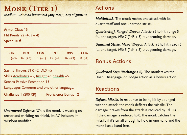 Customizing an NPC. For most situations, the following statblocks will be more than sufficient. However, for important NPCs you may want to customize them a bit to make them stand out. Just remember that with each ability you add, you sacrifice some of the simplicity and approachability of the statblock. Some abilities may also significantly increase the Challenge Rating of the NPC, so keep that in mind if you add more combat-centric abilities. To customize a monk of this tier, you can do the following: